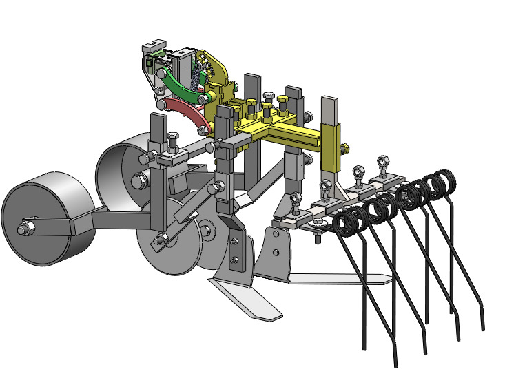 Parallélogramme 3 dents Parallélogramme 3 dents pouvant être utilisé en mode "inter-rangs" avec une roue de jauge pour biner entre les rangs ou en mode "enjambeur de rang" avec le module 2 roues pour biner avec plus de précision de part et d’autre du rang en passant au dessus. Plan PDF