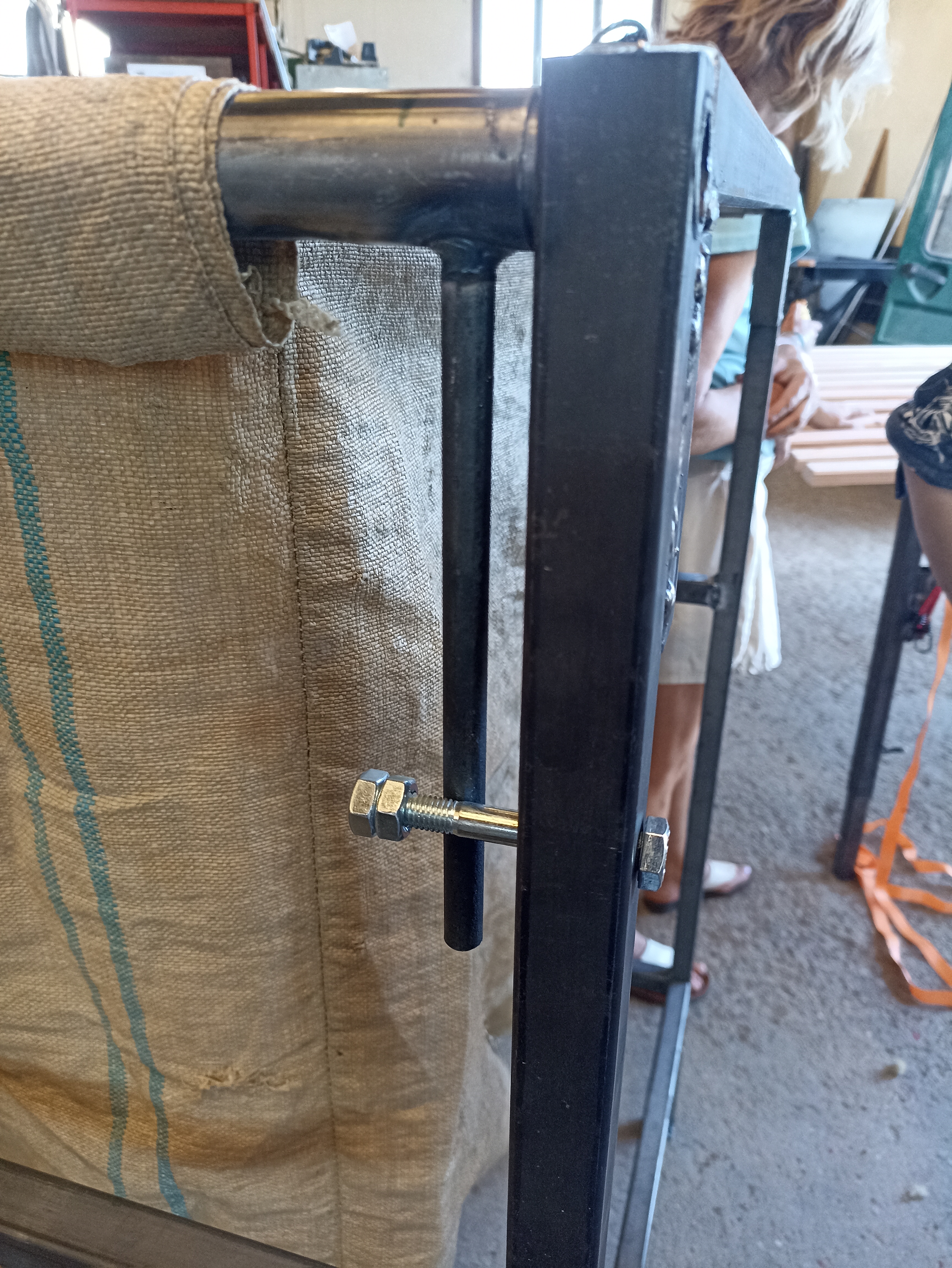 C’est à l’occasion d’une formation « table de tri de laine » en juin 2025 à Félines-Minervois qu’est venue l’idée de prototyper un porte-curon car ces derniers sont très onéreux et difficiles à trouver dans le commerce. Il a été imaginé avec Laines Paysannes, en s’inspirant de modèles auto-construits. L’idée étant d’avoir un outil relativement léger, facilement démontable, déplaçable et robuste. Il dispose d’un système de dépose en douceur du curon une fois celui-ci bien rempli et d’une échelle pour monter et tasser la laine.