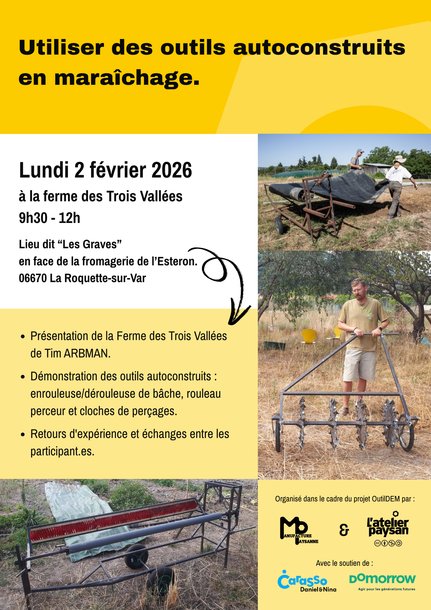 Lundi 2 février 2026 de 9h30 à 12h00 à la ferme des Trois Vallées située au lieu dit "Les graves" 06670 La Roquette-sur-Var (Alpes-Maritimes) aura lieu une démonstration d’outils dans la filière maraîchage.