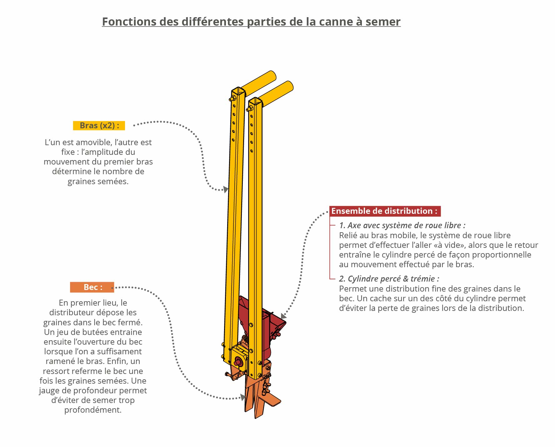 Cet outil permet de pénétrer le sol à la profondeur de semis, de distribuer le nombre de graines souhaitées et de déposer ces graines dans le sol, en un seul geste.