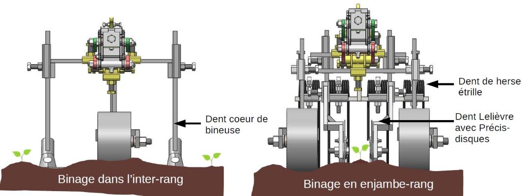 • Binage en trois rangs avec des parallélogrammes qui enjambent le rangs sur lesquels sont montés des dents Lelièvre avec des modules de précis disques et des dents de herse étrille. Le portique de disques de maintien de butte est ajouté à l’arrière.