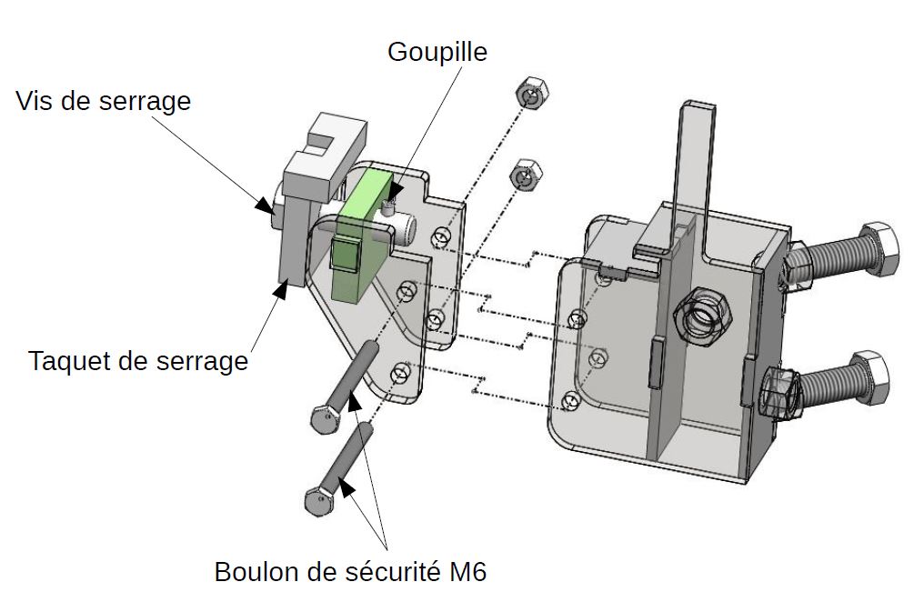 Chaque bride comprend un système de sécurité (voir figure ci-dessous). Les deux parties de la bride sont maintenues entre elles par des vis de 6mm de diamètre. En cas de sur effort, les vis cèderons avant que l’outil ne se torde.